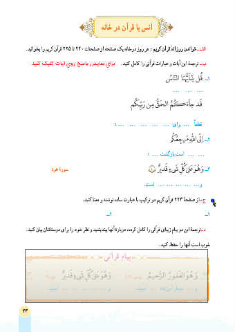 الف ـ خواندن روزانهٔ قرآن کریم :هر روز درخانه یک صفحه از صفحات 220تا 225قرآن کریم را بخوانید.